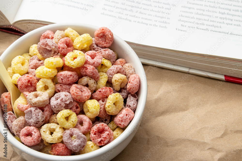 Breakfast cereal concept, Colorful ring cereals for breakfast meal and reading a book