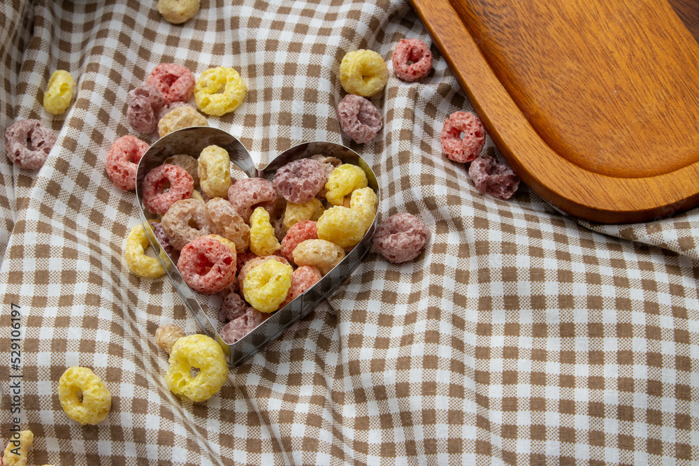 Healthy breakfast concept, Colorful ring cereals in heart shape container and fall on gingham cloth