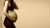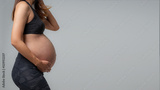 Woman standing and touching with hands her naked big belly. Isolated on gray background. Emotional loving pregnancy time - 37 weeks. Baby expectation. Love, happiness and safety concept. Closeup