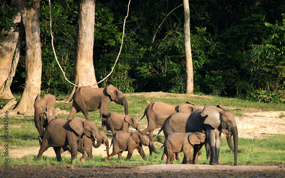 Group of African forest elephants (Loxodonta cyclotis) in the forest edge. Republic of Congo. Dzanga-Sangha Special Reserve. Central African Republic.