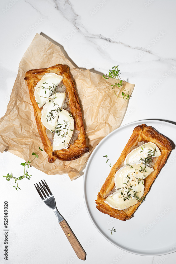 Tart with goat cheese, thyme and shallot onion on white marble table background. Traditional french cuisine pastry. Fresh, baked puff pastry dough. Cooking at home. Macro shot, selective soft focus