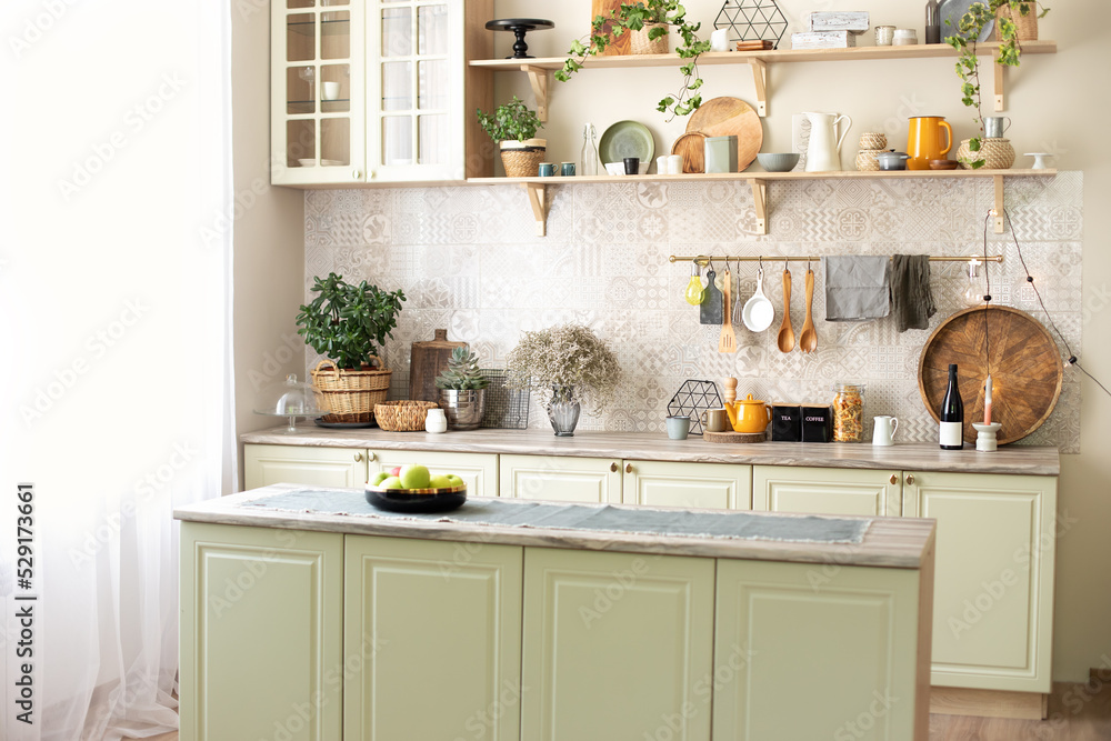 Stylish scandi cuisine interior decor. Ceramic plates, dishes, utensils and cozy decor on wooden shelfs. Kitchen wooden shelves with various ceramic jars and cookware. Open shelves in the kitchen.