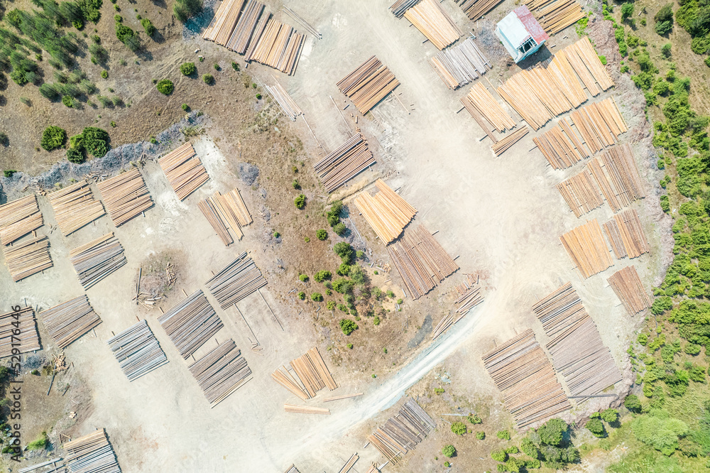Aerial view of sawmill with timber, chopped a lot of pine tree wood logs. Top, drone view