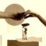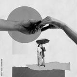Contemporary art collage. Cute young people, man and woman, loving couple walking together under umbrella. Autumn date