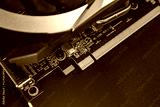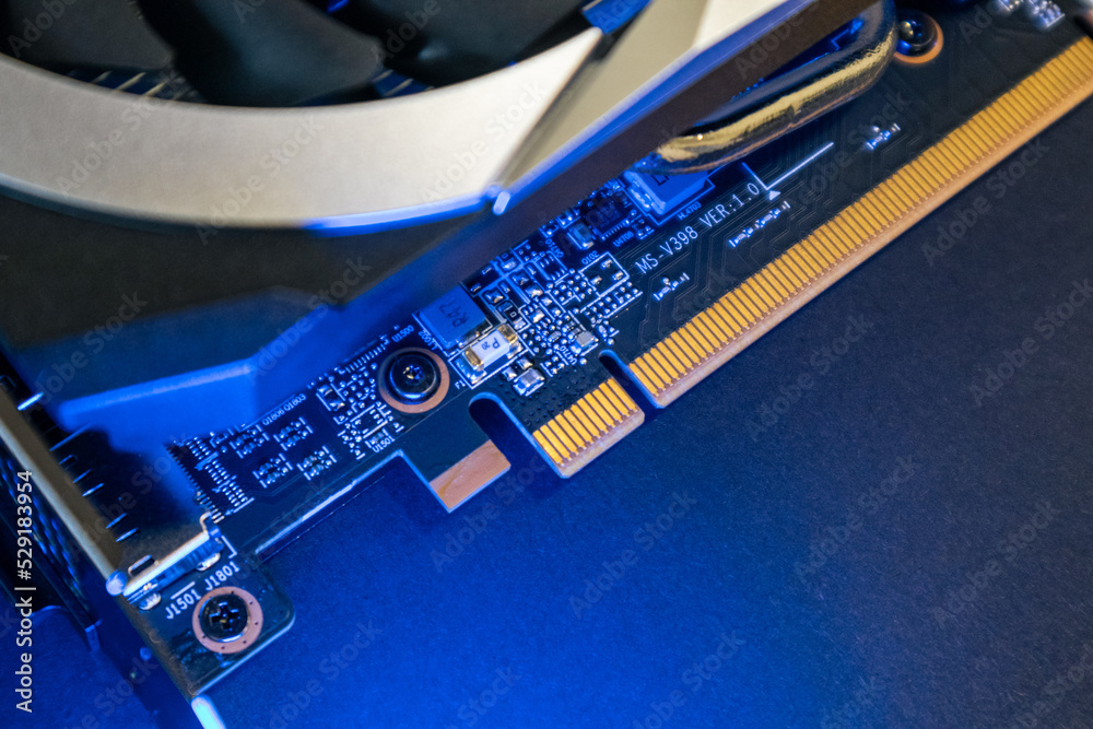 Gpu graphics or video card golden contacts panel chip close-up in blue light, PC hardware electronics details, components from powerful computer