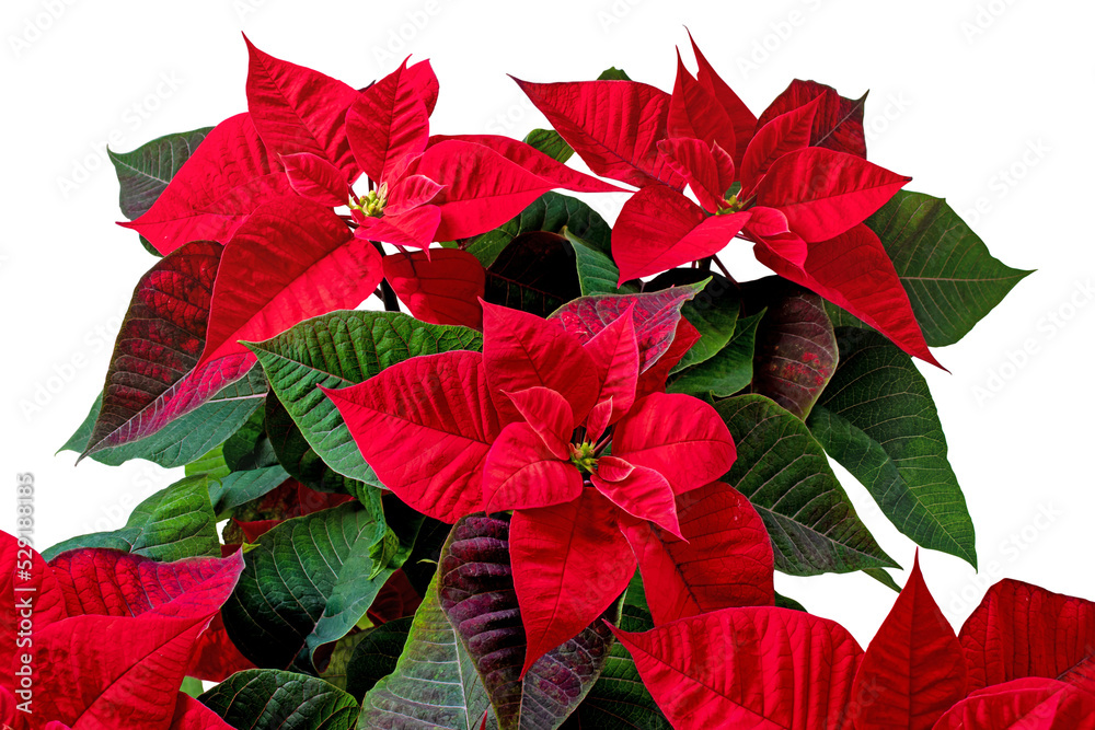 Poinsettia or Flor de Pascua flower isolated transparent png. Red euphorbia pulcherrima plant.