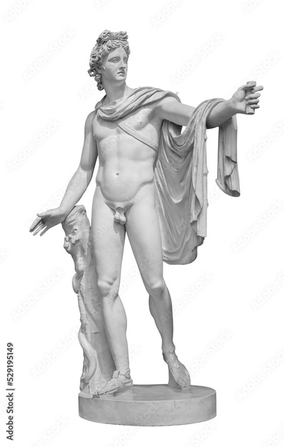 God Apollo sculpture. Ancient Greek god of Sun and Poetry Plaster copy of a marble statue isolated on white with clipping path