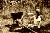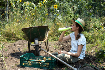 Woman Farmer Drinking Water in Shade During Harvest Hard Work on Potatoes Field
