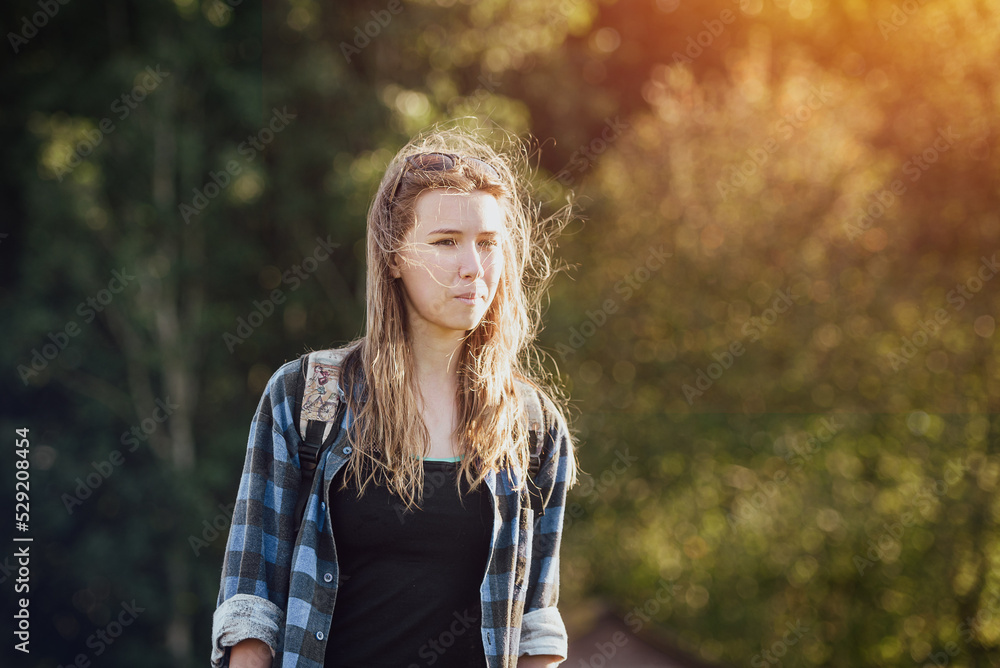 Young girl on the background of a summer park and hair in the wind