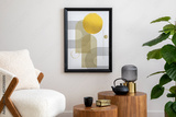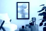 Creative and stylish living room with mock up poster, white armchair, coffee table and personal accessories Beige wall. Home decor. Template.