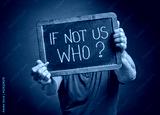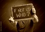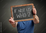 If not us who? A question in white chalk on a slate blackboard held by a man, call for action, motivation and communication concept