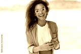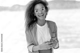 Online messaging. Glad african american girl with curly hair, wearing an orange shirt and orange glasses, stands outdoors, uses smartphone to exchange messages with friends, looks at camera, smiles