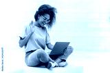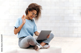 Busy successful african american young woman, business lady, sitting outdoors, holds online video conference by laptop, discuss financial strategy with colleagues, smiling.Virtual meeting concept