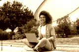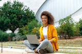 Modern lovely positive clever african american curly haired young woman, female student, freelancer, in stylish casual clothes, sitting with a laptop outdoors, looking at the camera, smiling happily