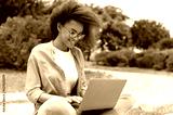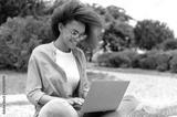 Busy successful african american curly haired young woman, student girl, freelancer, in stylish casual clothes, sit with laptop outdoors while online work or study, looking for information in internet