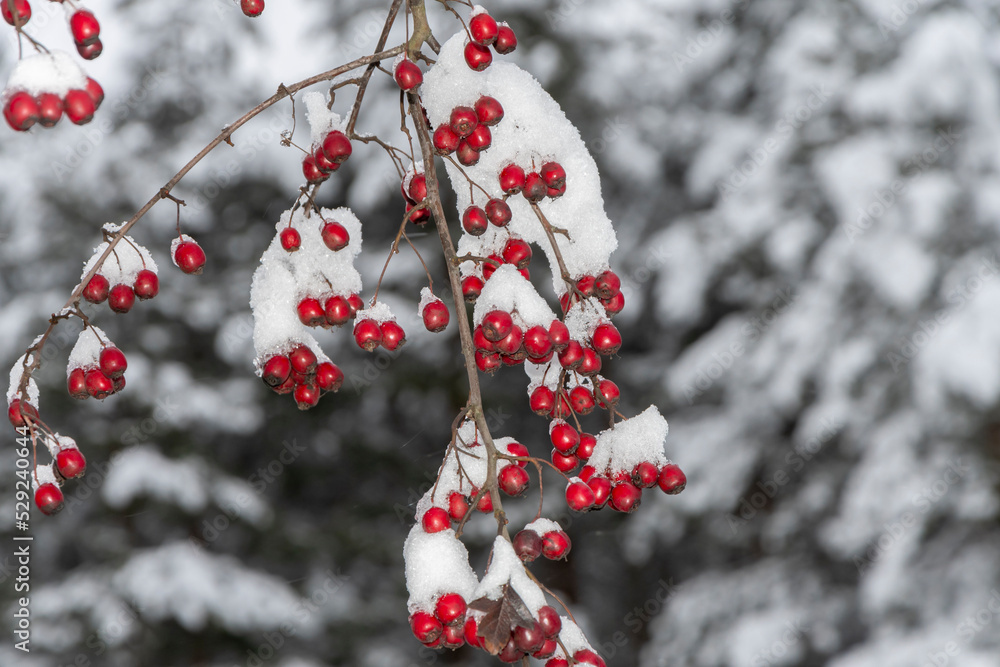 Red hawthorn berries hang on a branch covered with snow in winter.