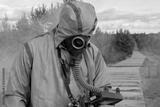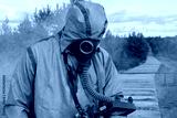 A military man in a chemical protection suit and a gas mask measures the level of radiation on a concrete road, smoke from fires. Concept: consequences of radiation leakage,