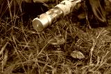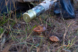 A military man in chemical protection measures the radiation level near mushrooms in the forest with a dosimeter, close-up. Concept: consequences of radiation leakage, radiation hazard.