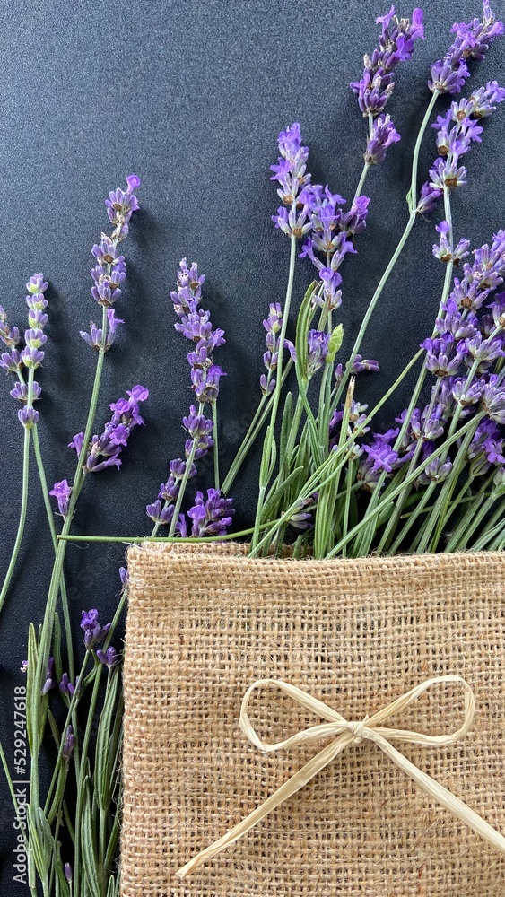 lavender on a gray background in a burlap bag