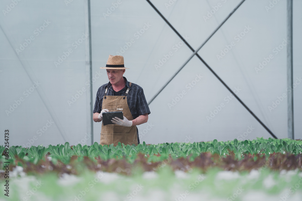 adult farming care agricultural business.farm farmer agriculture food fresh garden gardener gardening green greenhouse.Growing Hydroponic Lettuce.