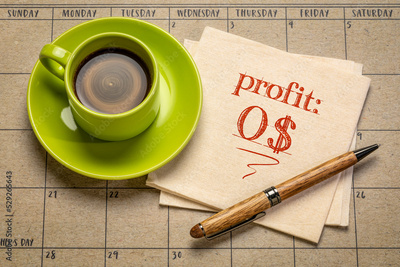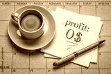 profit - zero dollars, handwriting on a napkin with coffee against desktop calendar, business failure concept
