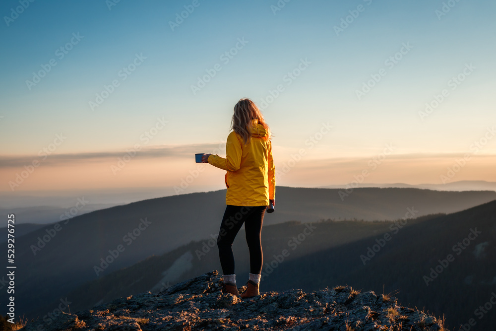 Woman hiker with hot drink enjoying sunset and view at mountain range