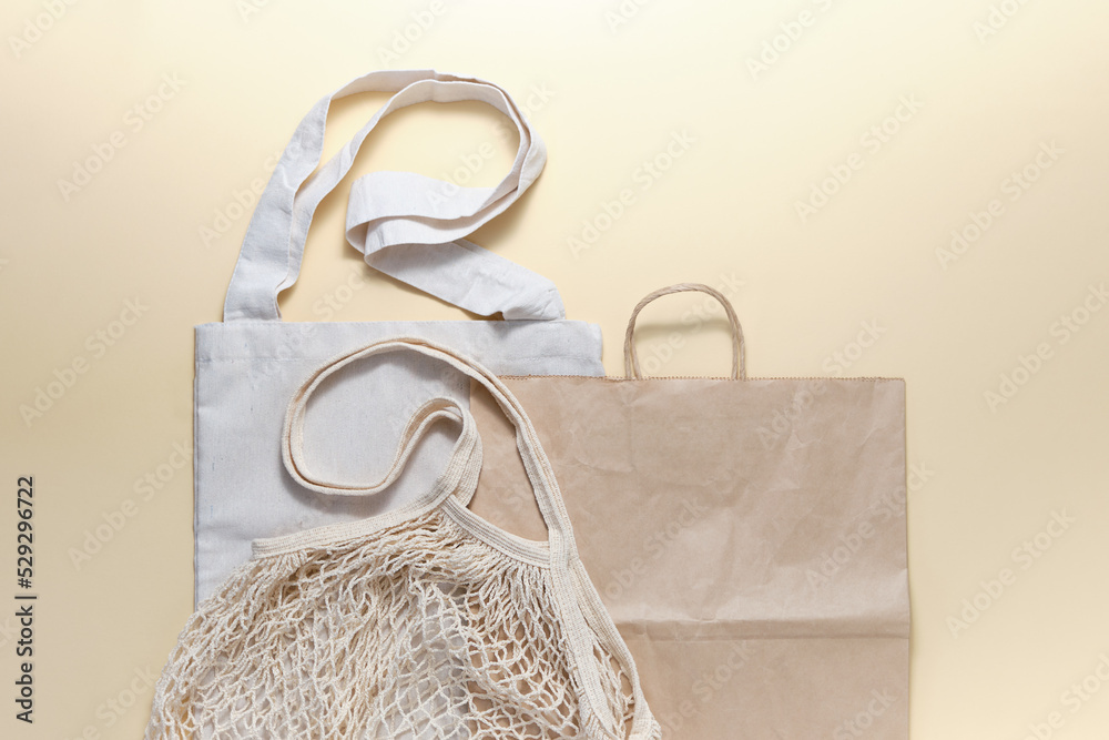 Eco-friendly shopping bags and paper bags on a beige background. The concept of minimizing consumption, zero waste, reducing the amount of non-degradable waste.