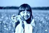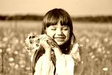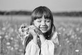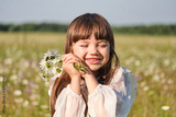 Portrait of a little smiling girl in a white dress on a chamomile field on a bright sunny summer day