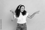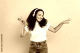 Cheerful lovely young brunette mixed race woman, in casual stylish wear, with headphones, listens her favorite music, dancing with eyes closed, relaxing, having fun on isolated orange background,smile