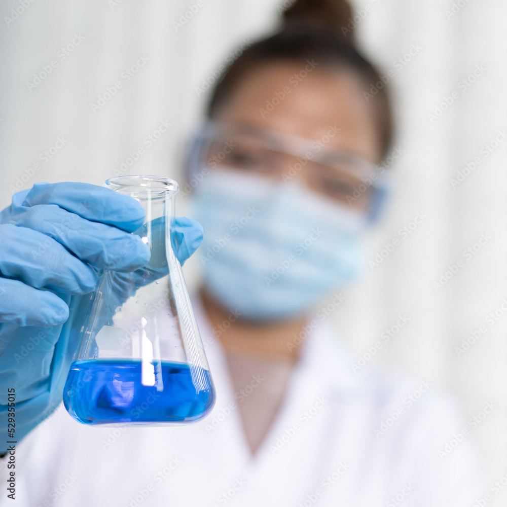 Scientists are carrying blue chemical test tubes to prepare for the determination of chemical composition and biological mass in a scientific laboratory, Scientists and research in the lab Concept.