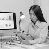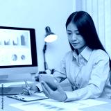 Asian female employees are analyzing market data via smartphones and have laptops to calculate the company's finances In a private office at home, Working at home and new normal concept.