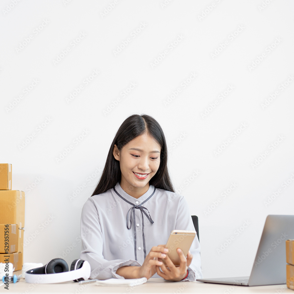 Young Asian women are selling products online and are using mobile phones to chat with customers to confirm orders, Selling products online or doing freelance work at home concept.