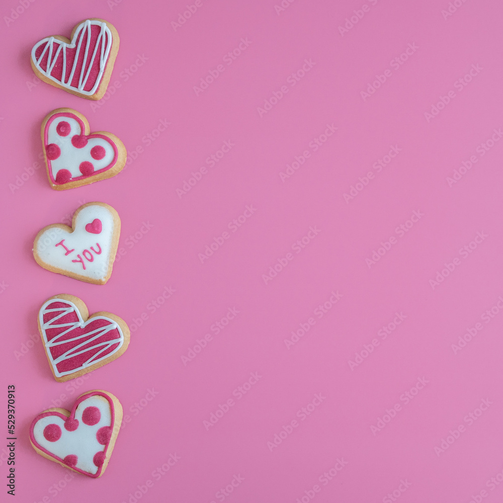 Line of Heart Shaped Valentine Cookies on Pink Background with Copy Space