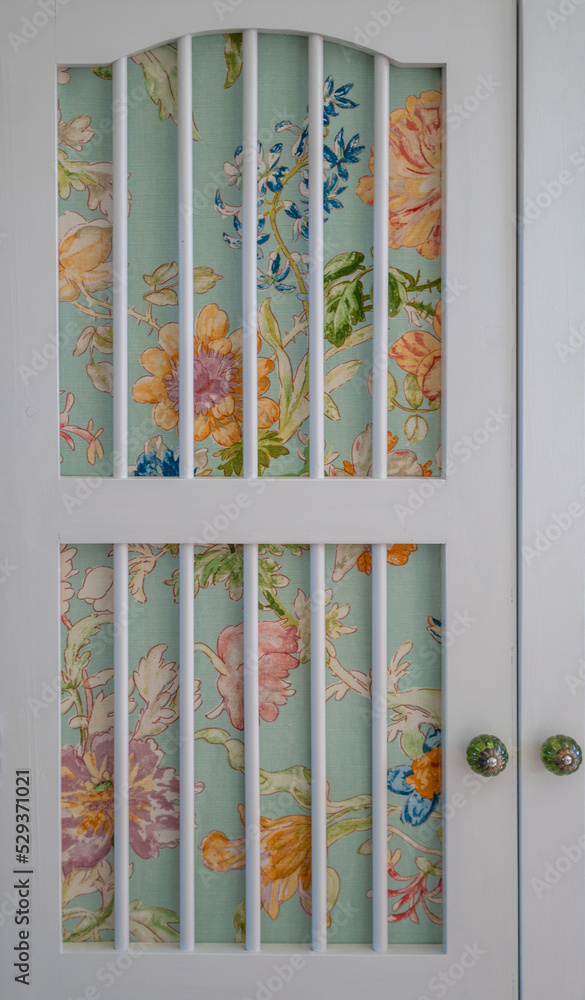 Close Up of Bright White Cupboard Doors with Floral Inset