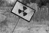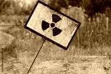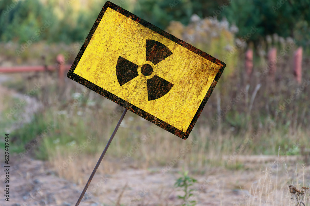 Tilted Old textural Sign of radiation hazard on the background of nature and forest, evening lighting.