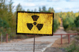 Tilted Old textural Sign of radiation hazard on the background of nature and forest, evening lighting.