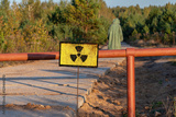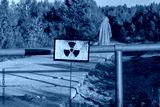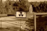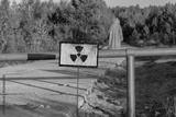 a sign of radiation danger against the background of a forest and a road, a Russian military man in chemical protection enters the zone of radioactive contamination,