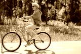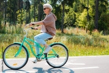 Senior older elderly modern woman rides a bicycle in a city park in the forest. Active pensioner, health lifestyle