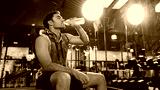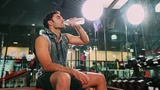 Asian male bodybuilder is sitting on fitness bench and drinking water to cool down his body after workout in gym. Shot of athlete holding a water bottle. Health care, fitness and lifestyle concept