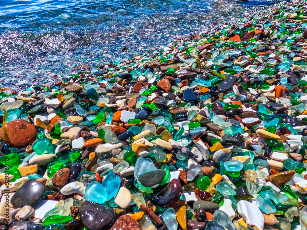 Natural polish textured sea glass and stones on the seashore. Azure clear sea water with waves. Green, blue shiny glass with multi-colored sea pebbles close-up. Beach summer background.