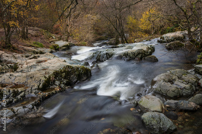 Stunning vibrant landscape image of Aira Force Upper Falls in Lake District during colorful Autumn showing