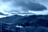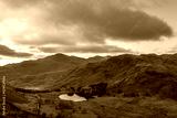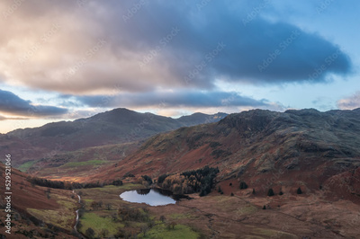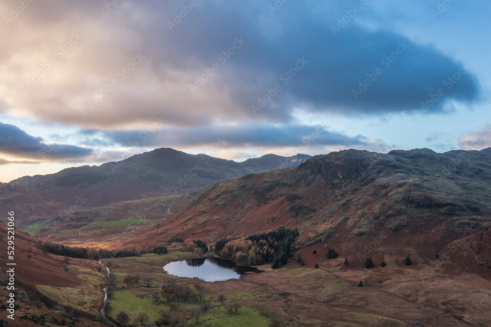 Beautiful aerial drone landscape image of sunrise from Blea Tarn in Lake District during stunning Autumn showing