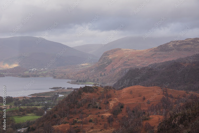 Stunning landscape image of the view from Castle Crag towards Derwentwater, Keswick, Skiddaw, Blencathra and Walla Crag in the Lake District