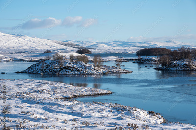 Beautiful Winter landscape image looking towards Scottish Highlands mountain range across Loch Ba on Rannoch Moor
