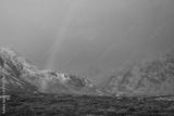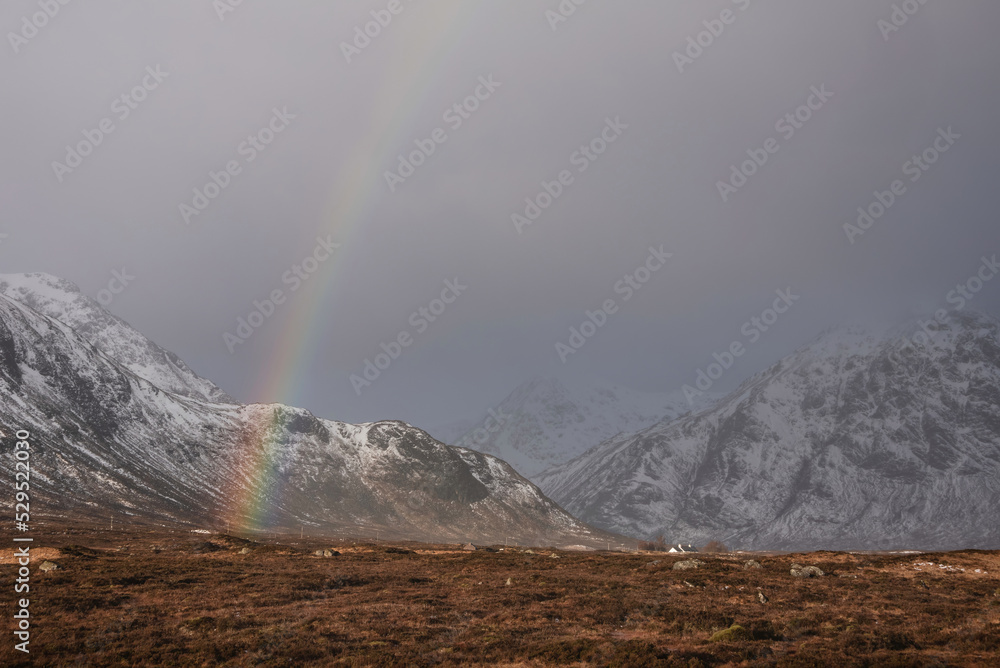 Majestic landscape image of vibrant rainbow in front of mountains in Scottish Highlands Rannoch Moor Stob Dearg