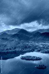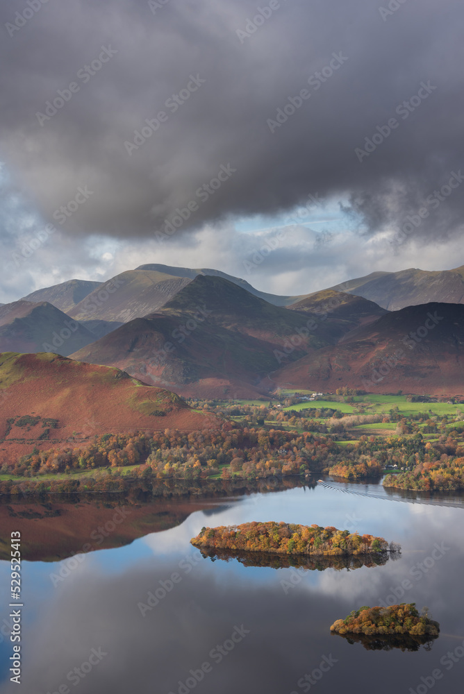 Beautiful landscape Autumn image of view from Walla Crag in Lake District, over Derwentwater looking towards Catbells and distant mountains with stunning Fall colors and light