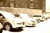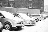 A row of cars covered in snow with lifted wipers up stands near the building on a snowy day. Heavy. Infrastructure. Stationary. No People. Residential. Bad. Temperature. Icy. Snowy. Deep. Problem