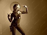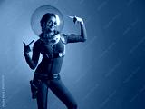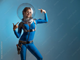 Fantastic astronaut costume in retrofuturism style. A young beautiful blonde in a blue suit with a spherical helmet. pioneer of space exploration, atomic era, retro style