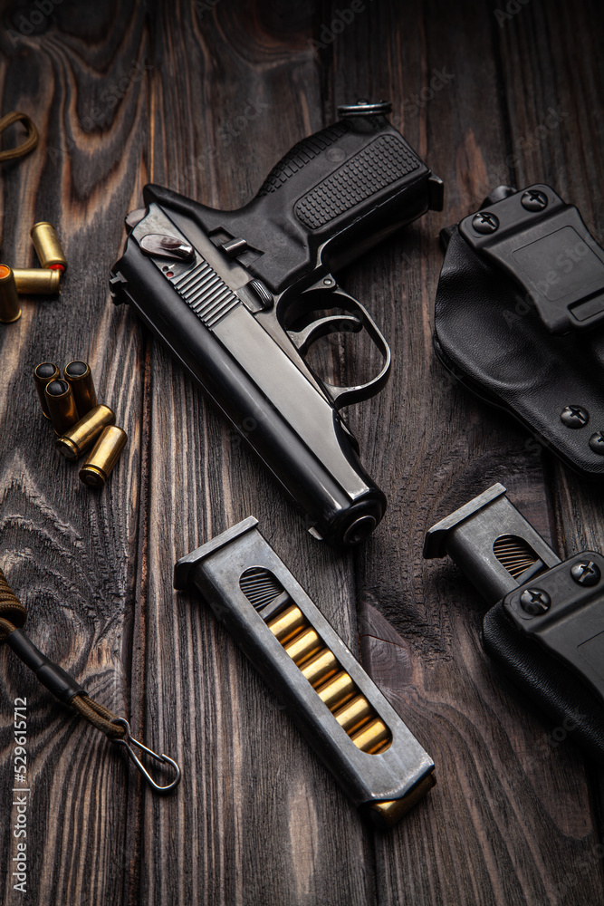 A modern black pistol and ammunition on dark metal back. Weapons for police, army, special forces.
