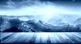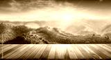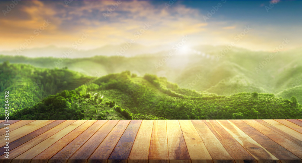 Brown blank wooden table top with the mountain landscape. table background of free space for your decoration and blurred landscape of mountains. orange sky sunset in the evening.